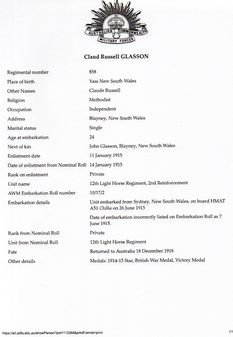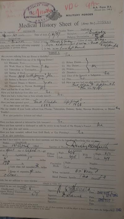 I have a lot of information about Dudley from his enlistment papers which are held here in Canberra. From the form below, I learned that Dudley had the family gall bladder problem, that he had never been vaccinated in his life and that he had contracted the Spanish Flu, which killed millions round the world in 1919, after World War 1 (and was the last pandemic before the Covid 19 which is sweeping the world as I write in 2020).