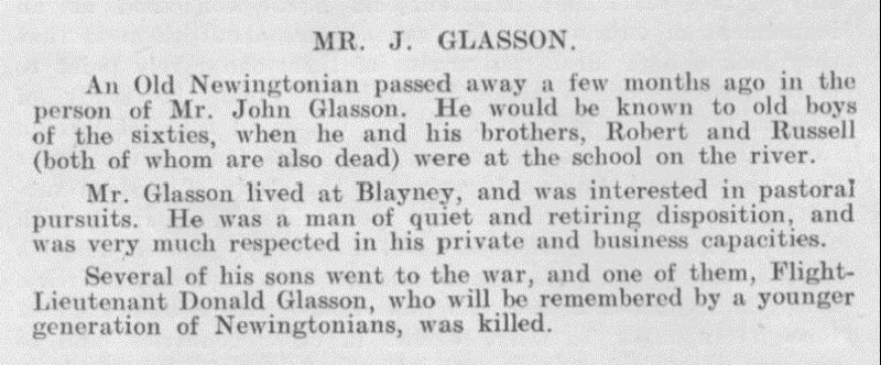 Note: My reference for information about the Glassons, is from The Glasson Saga by Mary Glasson, published in 1980.