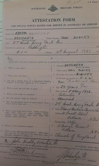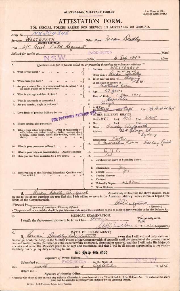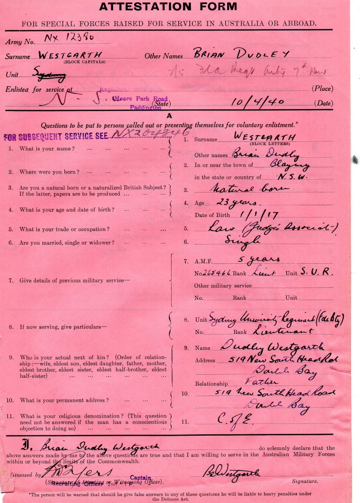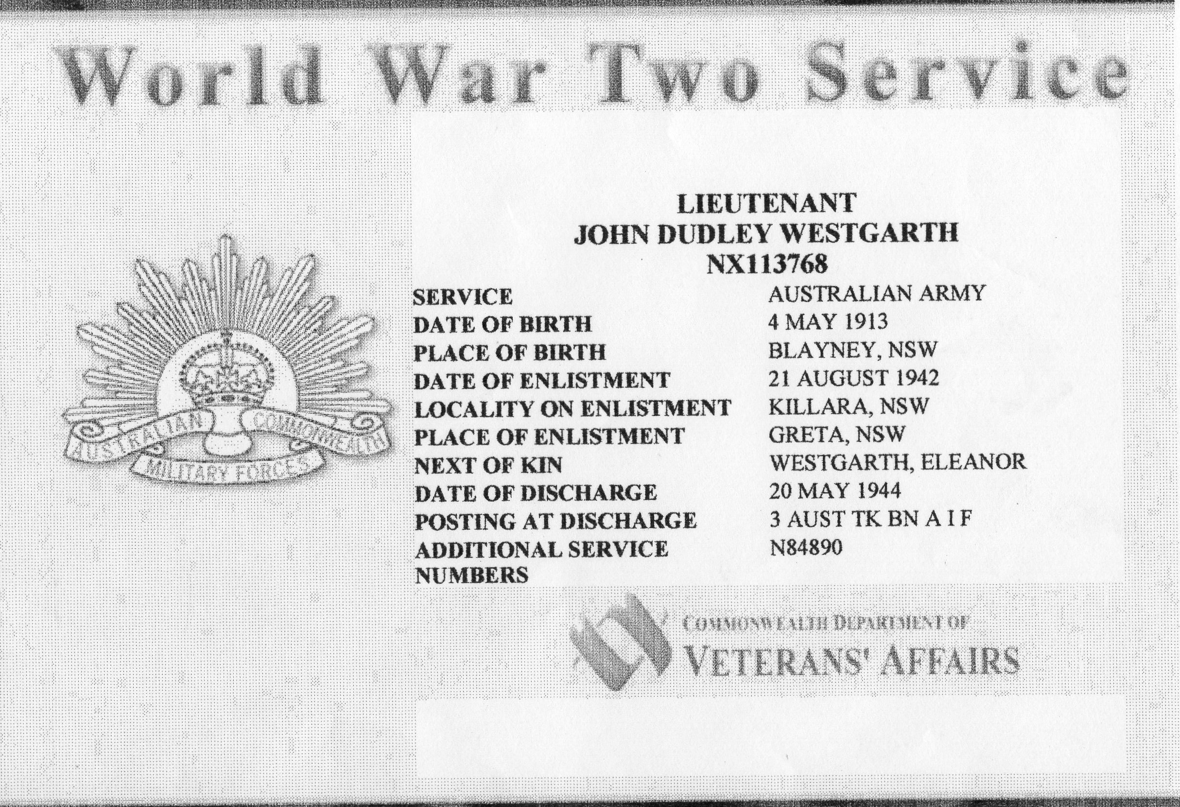 Westgarth, Donald Dudley; Army Number – N9784; Date of birth – 13/10/1921