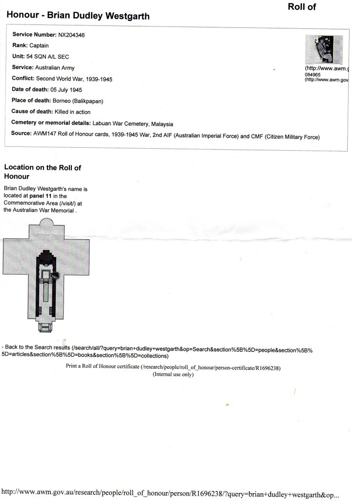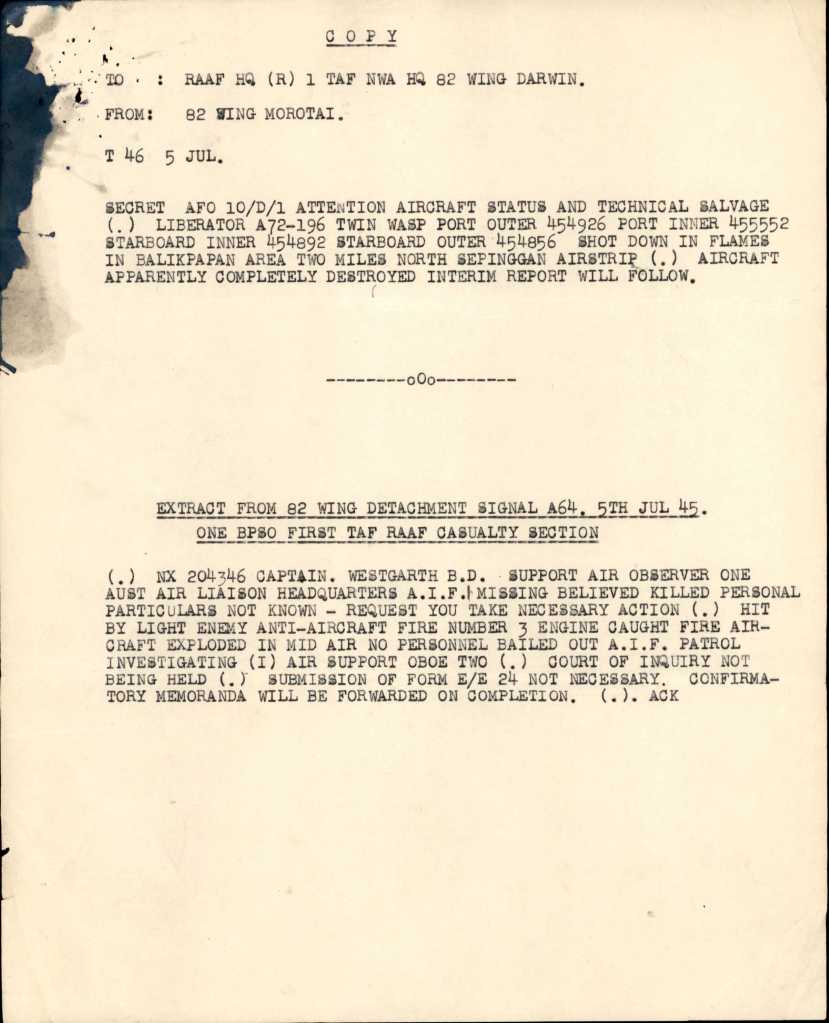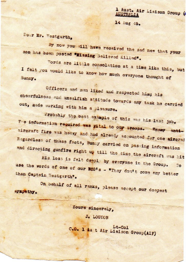 On 5th July 1945. on a mission in a Liberator bomber over Balikpapan, southern Borneo, where the Japanese had bases, Bunny and all the crew were killed. Here is a report issued the same day: