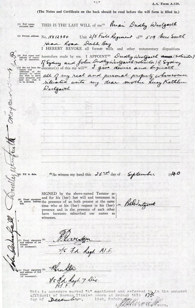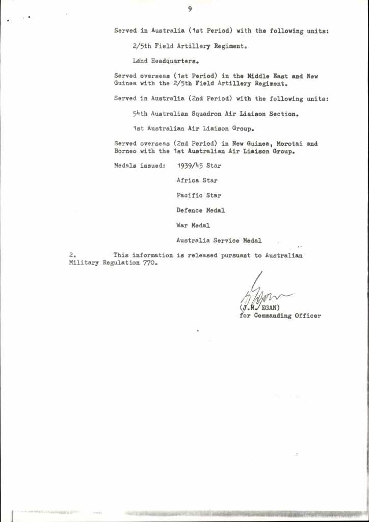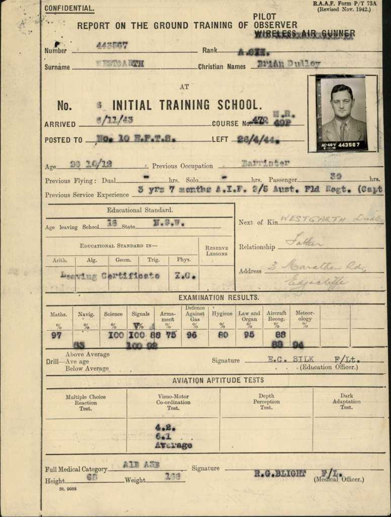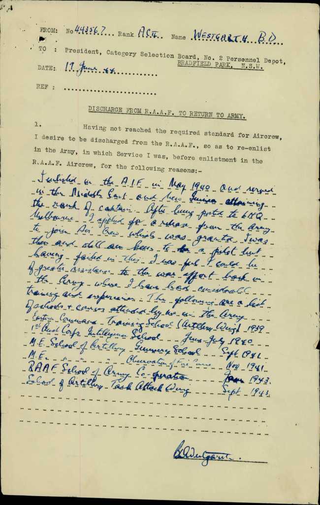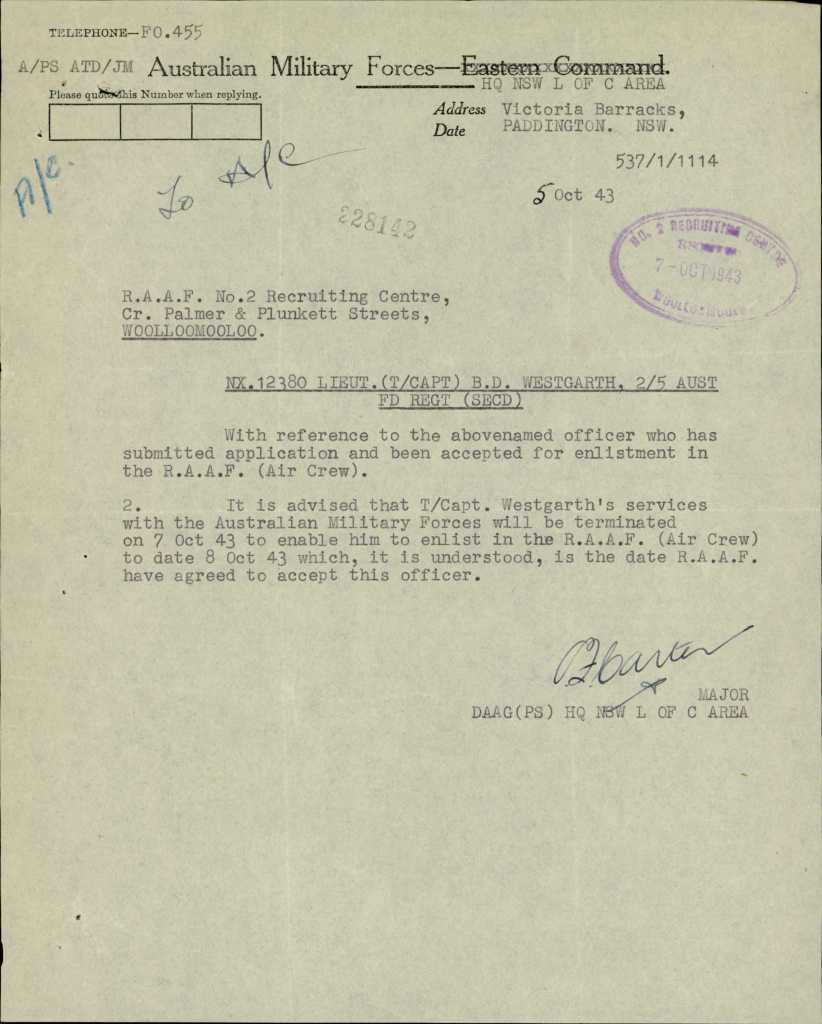 After his service in the 2/5th Australian Field Artillery Regiment, in the Middle East and then New Guinea, He embarked for Australia on 7th February 1942 and debarked on 18th May. He then worked at headquarters in Melbourne. in 1943 with the Japanese approaching through the islands, Brian applied to join the RAAF and become a pilot: