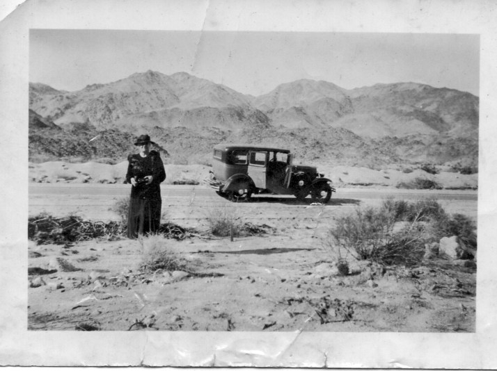 Miss Campbell had a little dog and her own car. Here is her photo. Miss Campbell looks like she has driven into the interior somewhere.