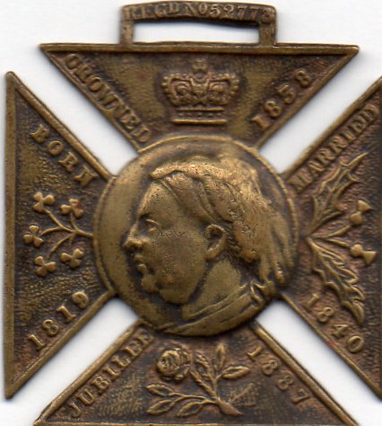 20th June 1887 was the date of Queen Victoria’s Golden Jubilee celebrations. A jubilee is a celebration of 50 years; Victoria had reigned from 1837 to 1887 and would continue to reign until 1901. As the colonies of New South Wales, Victoria, Queensland, Western Australia , South Australia and Tasmania were part of the British Empire, many towns struck a commemorative medal. This one is bronze, washed gold, in the shape of a Maltese Cross.