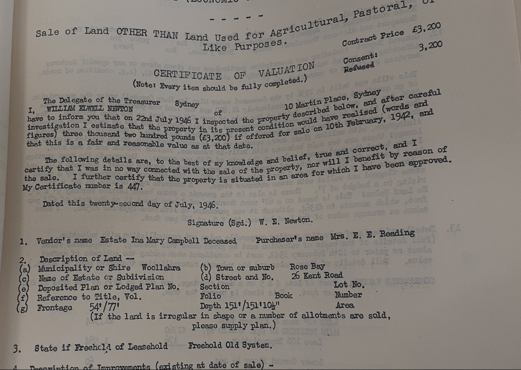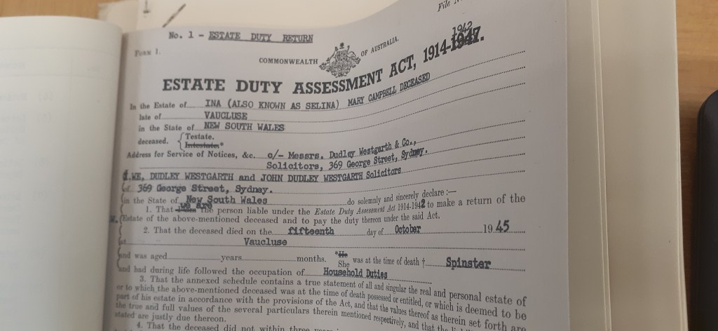 I found information in the National Archives about the Estate of Ina Mary Campbell, sometimes called Selina, who died on October 15th 1945. She was a very unusual in leaving two houses, money and other assets so that her Estate totalled £18,106/18/2d (eighteen thousand, one hundred and six pounds, eighteen shillings and tuppence. As her house at 26 Kent Road Rose Bay was valued at £3,200, you can see that she was a fabulously wealthy single woman.