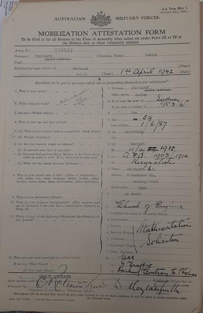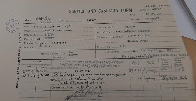 Dudley was given a NX number for the Australian Imperial Forces (AIF) which was the Army, but he seems to have stayed in the CMF and was demobilised in 1944. Here is the official form which has his CMF number 225537.