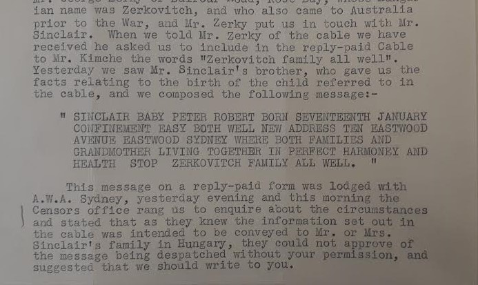 - Another case shows just how paranoid a country can become in wartime. Two Jewish Hungarians and their families managed to reach Australia from Switzerland before the war and thus escape Nazi extermination. They changed their names from Szeklei and Jerkovitz to Sinclair and Zerky. (Cousin Julie was in the same class at school with Julie Zerky!) When the Sinclairs had a new baby, named Peter Robert, they composed a telegram to inform their parents in Hungary. As it was wartime, the Commonwealth refused to allow the telegram to be delivered in case it was a message to the enemy! (Trading with the Enemy Act, 1939-1940) Here it is, with part of an explanation by Westgarths to the Commonwealth: