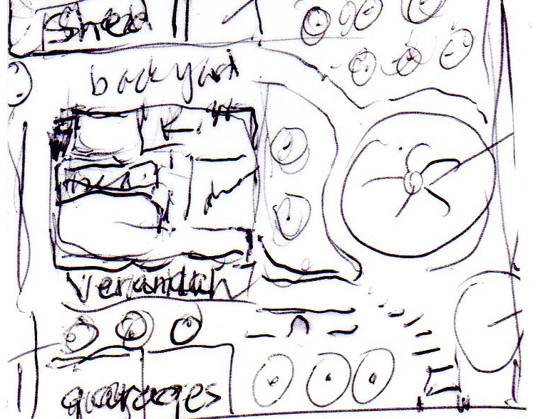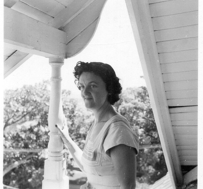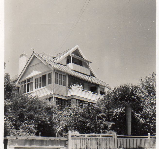 The garage was on the street which was walled right along with Sydney sandstone. You walked up steps to a verandah at the front of the house. Above the verandah there was a second storey with a peaked roof and a balcony which looked up the Harbour to the Bridge. It was a red tiled house with a large garden on the right where the trees are. The first tree at the gate (which is not visible on the right), was a macadamia and at the top of the stairs there was a huge palm in a circular garden. Behind the house round the cement yard were sheds, some citrus trees and a banana palm.