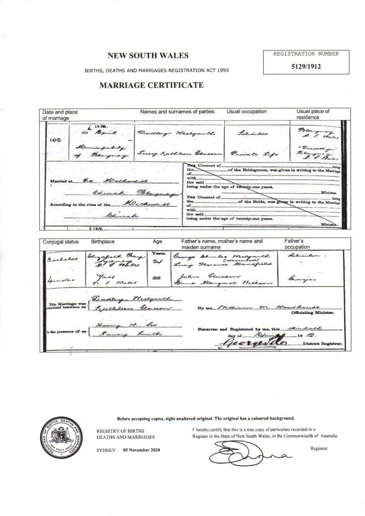 Neil Thornton provides the following information about Dudley’s work in Blayney: Dudley joined the practice of George Pile in Blayney and immediately began networking. He joined the Freemansons and was already assistant secretary of the Blayney Branch of the Freemasons in 1910. Then, in March 1911 he became secretary of the Blayney Show Society (Bathurst Times, Saturday 11th March 1911). He had really settled into Blayney socially. Then, on 12th July the same year, 1911, Dudley and George Pile, his business partner, registered a legal partnership, ‘Pile and Westgarth, Solicitors’, a partnership that would last until 1925.