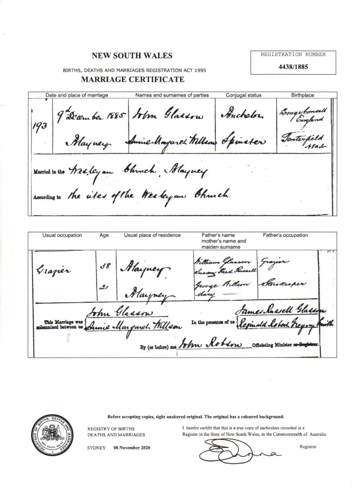 Anne Margaret Willson was born in Tenterfield, New South Wales. Her parents, George and Mary, were shopkeepers in Blayney. I imagine the couple met through the Methodist Church, in which they were married. John Glasson had established himself on the land by 1885 and would have been looking for a wife. He was 38 and she was 21.