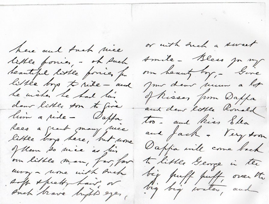 This is a letter from Dappa to his own sweet little George to tell him how much Dappa loves him and how he always thinks of his bright and bonnie little mannie – Dappa sees such pretty horses here and such nice little ponies – oh such beautiful little ponies for little boys to ride – and he wishes he had his dear little son (sic) to give him a ride –