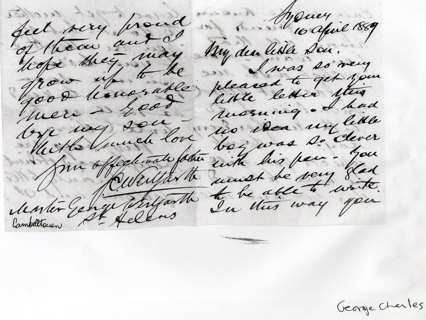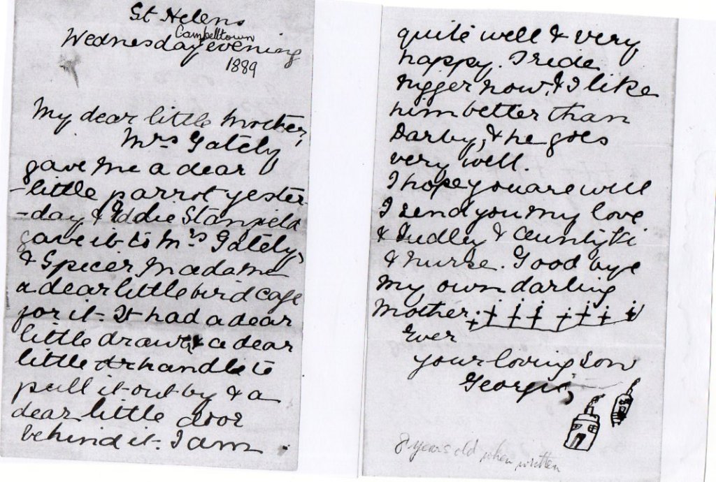 These country retreats of prominent members of society, who were not landowners, were made possible by the development of the railways. By 1886, George Charles had decided to purchase land nearby at Appin and in 1887 he built a country home, St Helens, designed by his architect father-in-law. George Mansfield, Ronald and Gwendoline would soon be living there, with their stepbrother, Jack (10) and stepsister Ella (14). Then a brother, Dudley, was born at Tresco on June 1st 1887 and another, brother, Mervyn, was born in 1888, so a country home with horses, cows, wildlife and bush to explore must have been idyllic for these lucky children. Here is a letter which was kept by Judy Westgarth, written by George Mansfield when he was 8. In it, he expresses his love of life at St Helens through his childish words.