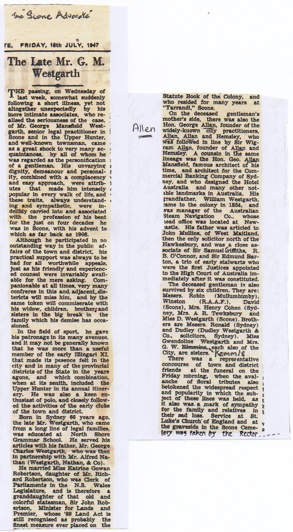 In Scone George Mansfield enjoyed rifle shooting, something he probably had plenty of practice doing at St Helens. He was a member of the Scone Rifle Club and the Singleton Argus of 19th August 1915 reported that the Scone Club defeated Singleton that year and G.M.Westgarth contributed to that victory. He was also keen on horse racing, another pastime of his youth, and there are many articles recording his attendance at different racing carnivals in the area.