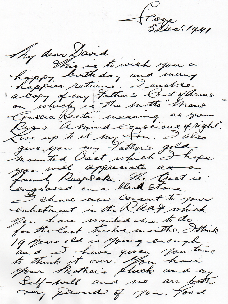 This is to wish you a happy birthday and many happier returns. I enclose a copy of my father’s coat of arms, on which is the motto: “Mens Conscia Recti” meaning, as you know, “A mind conscious of right”. Live up to it my son. I also give you my father’s gold mounted crest, which I hope you will appreciate as a family keepsake. The crest is engraved on a blood stone.