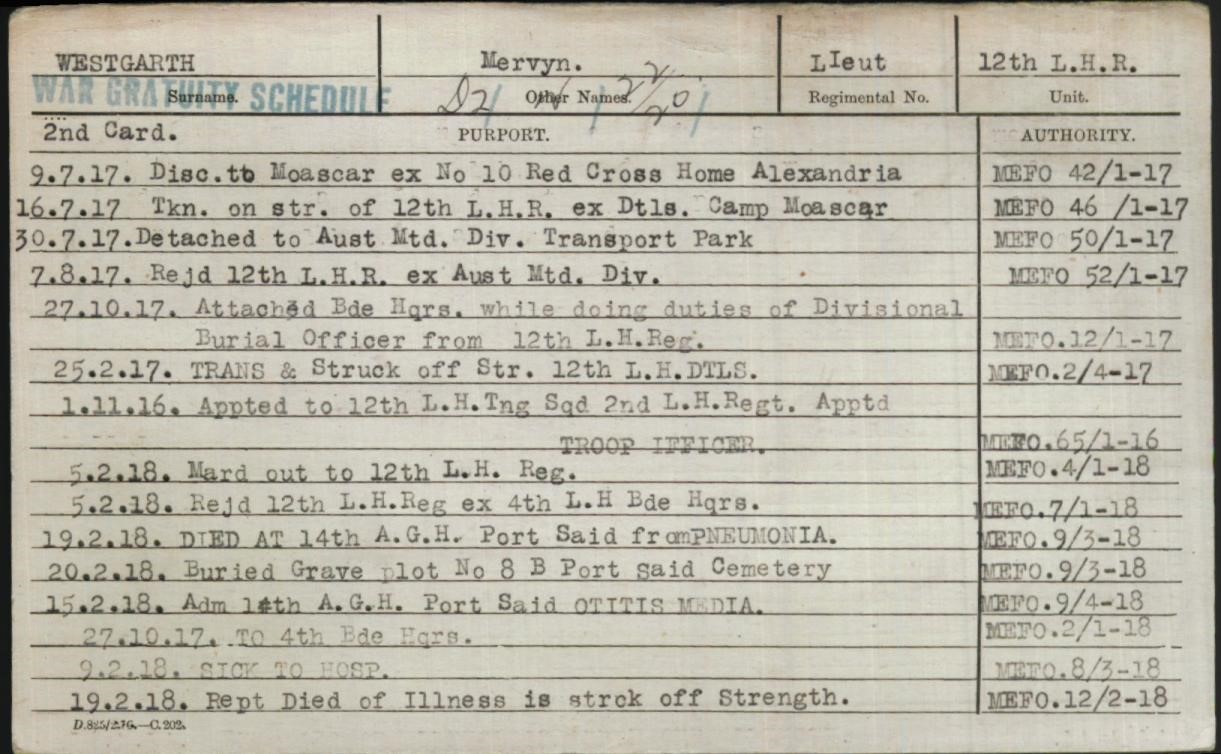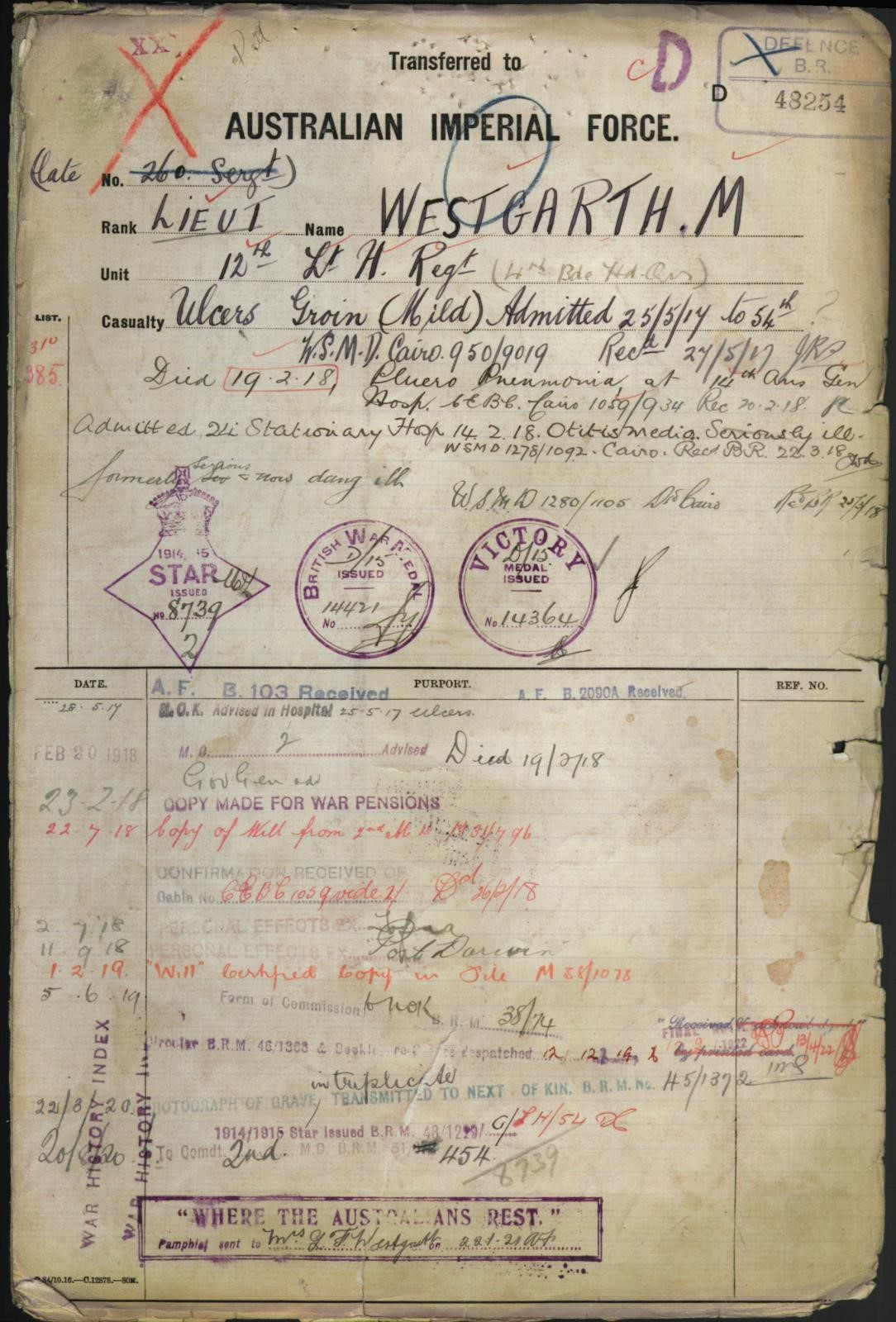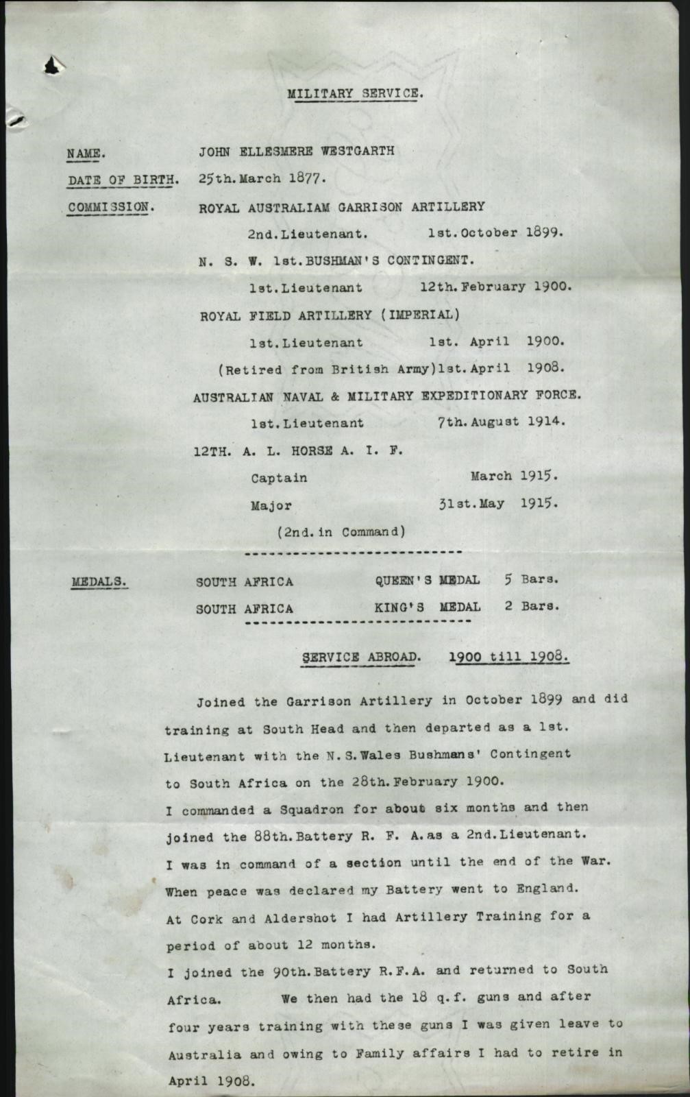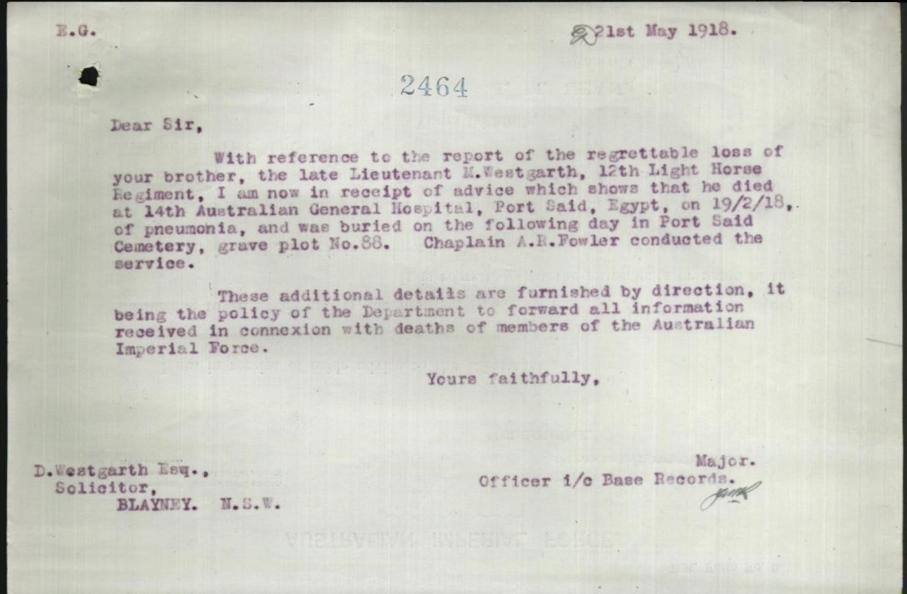 ‘The late Major Westgarth was the eldest son of the late Mr G. C. Westgarth and saw service in South Africa. After the Boer War he went to England and held a commission in the Royal Field Artillery. He enlisted in 1914 and went to Rabaul. On his return to Australia, he re-enlisted in the Light Horse and went to Palestine, being invalided back to Australia some months ago’.