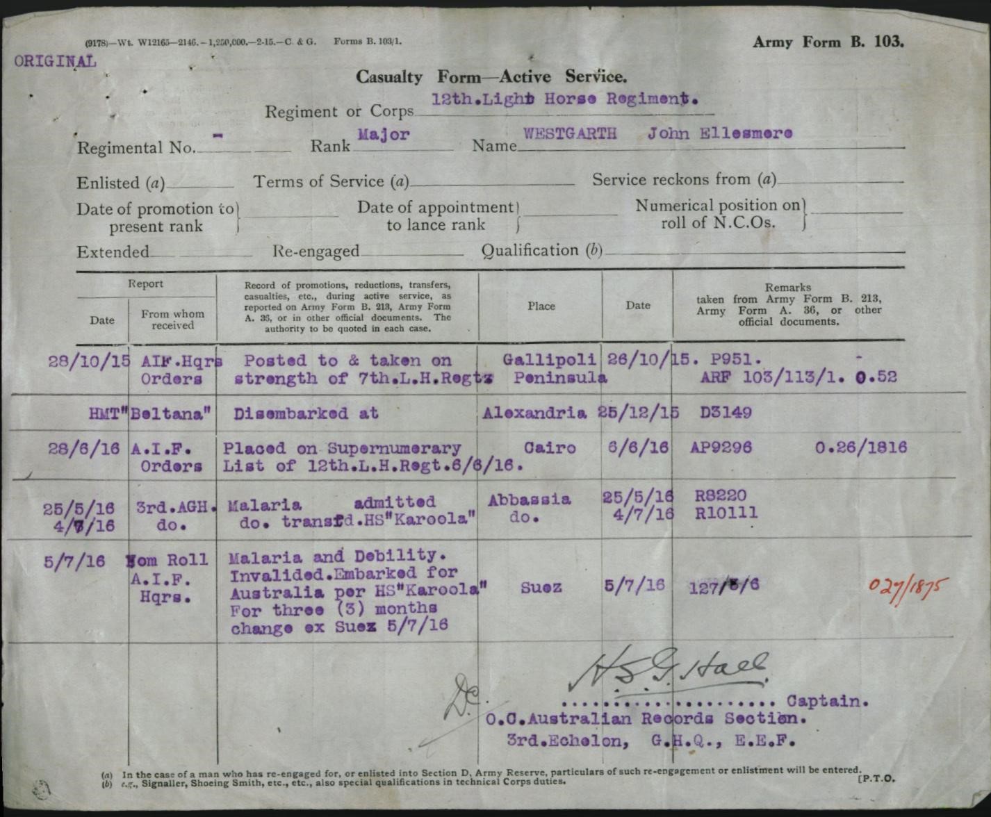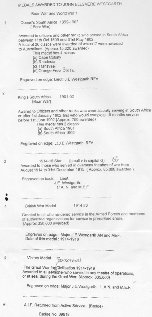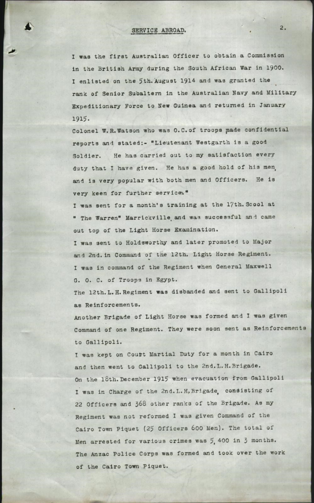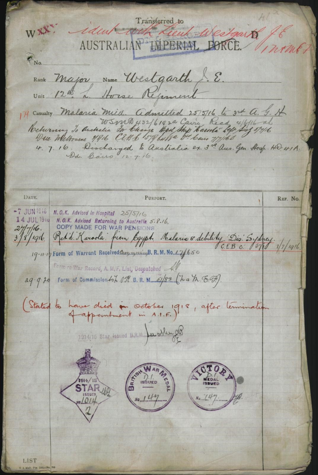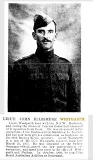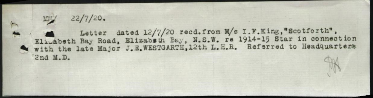 ‘The late Major Westgarth was the eldest son of the late Mr G. C. Westgarth and saw service in South Africa. After the Boer War he went to England and held a commission in the Royal Field Artillery. He enlisted in 1914 and went to Rabaul. On his return to Australia, he re-enlisted in the Light Horse and went to Palestine, being invalided back to Australia some months ago’.