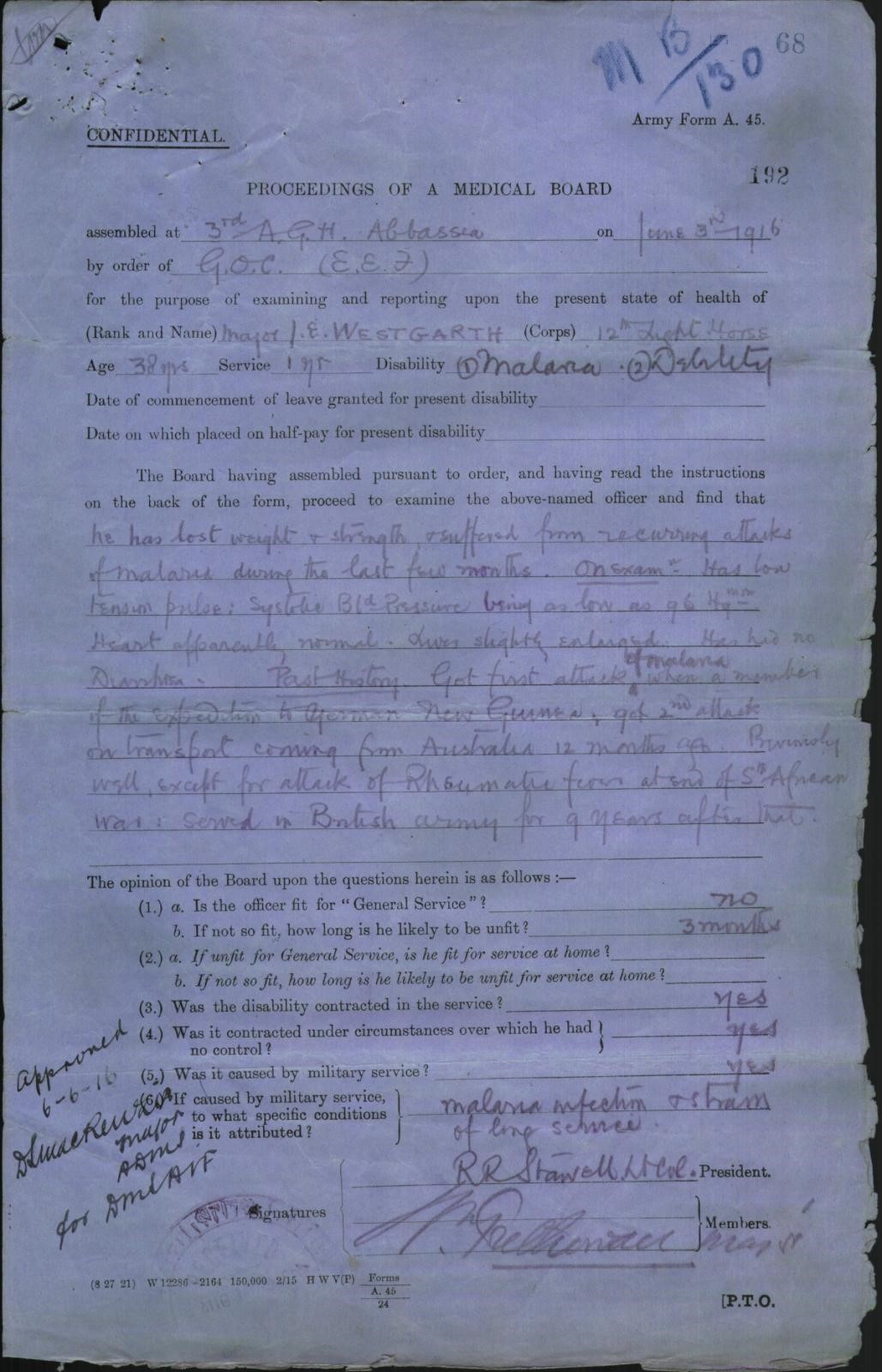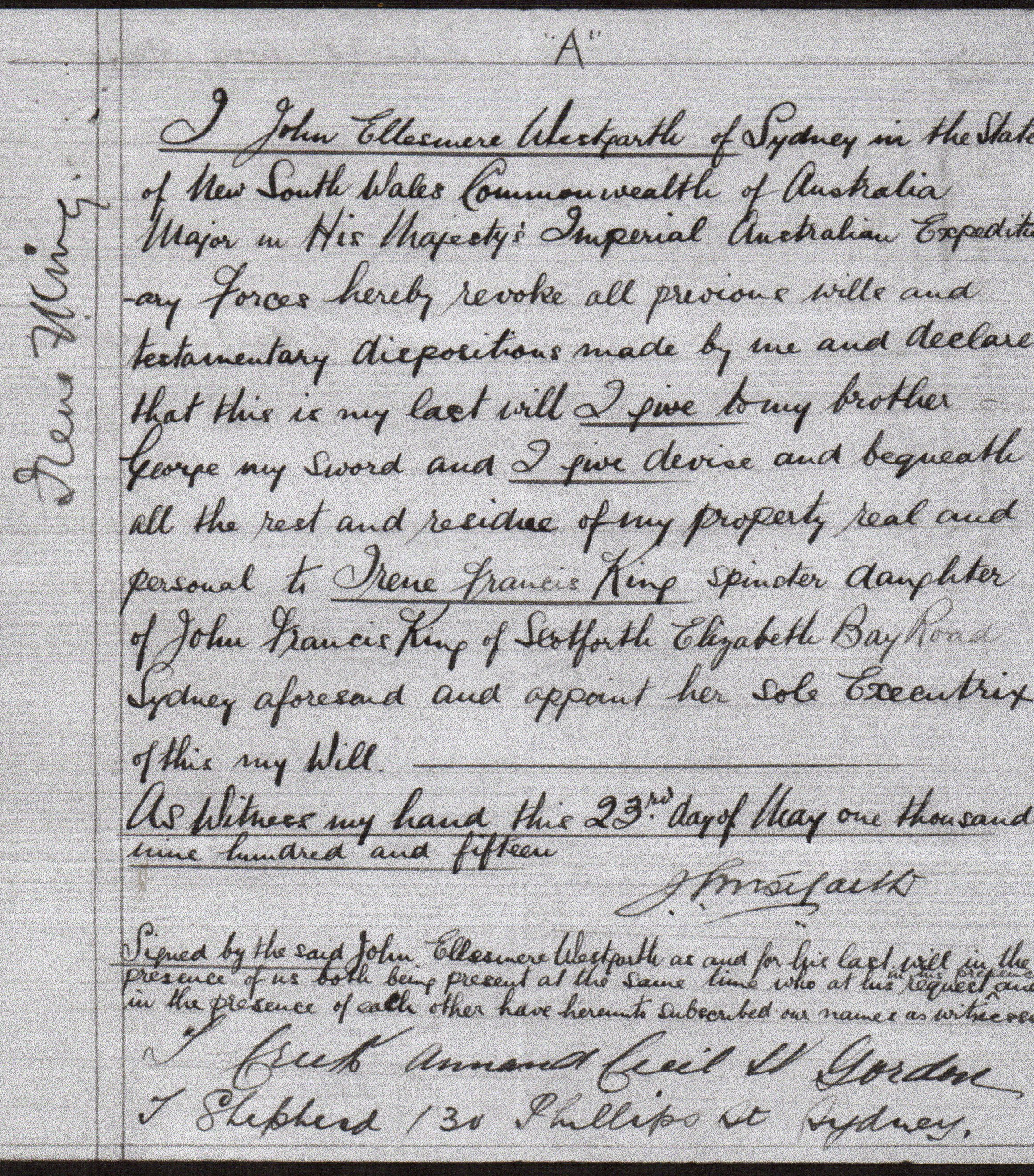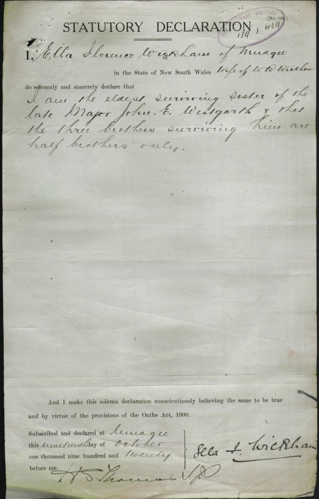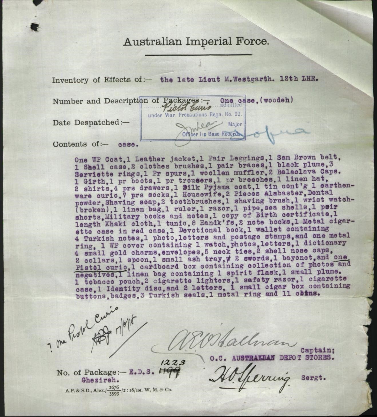 ‘The late Major Westgarth was the eldest son of the late Mr G. C. Westgarth and saw service in South Africa. After the Boer War he went to England and held a commission in the Royal Field Artillery. He enlisted in 1914 and went to Rabaul. On his return to Australia, he re-enlisted in the Light Horse and went to Palestine, being invalided back to Australia some months ago’.