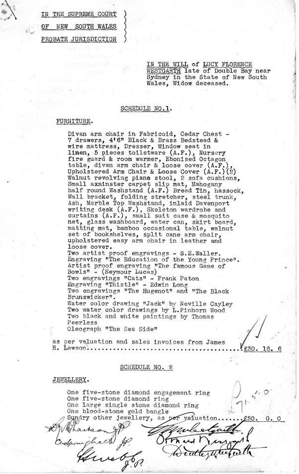 And who were her executors? Her three living sons together signed all the paperwork for the execution of her affairs. See below: Each signature has to be verified by a Justice of the Peace on this list of personal belongings. Interesting to see that the sapphire and diamond cluster ring is no longer on the list!
