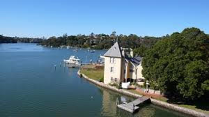 Fortunately, Fig Tree House, with its distinctive timber tower, (number 1 Reibey Road), remains. It is the oldest house in Hunters Hill. Originally owned by convict businesswoman Mary Reibey, Fig Tree Farm was later bought by Didier Joubert, and his son added the tower. Douglass Baglin, who produced many photographic books on Australia, lived nearby and recorded this scene from an earlier bridge to the west. https://shop.sl.nsw.gov.au/fig-tree-house-hunters-hill/