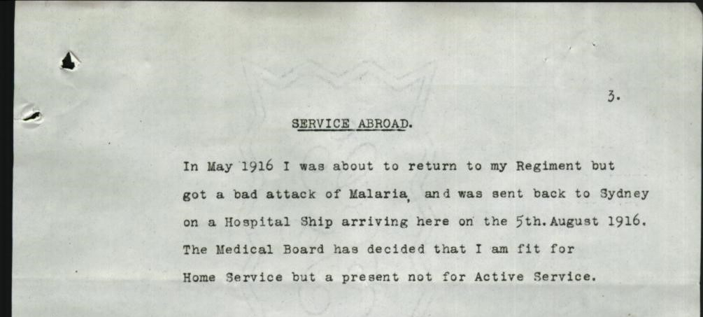 This they did. very swiftly, returning to Australia in January 1915, but whilst in New Guinea John fell ill with malaria. He was discharged from the ANMEF on 6/2/1915, but his health had been permanently damaged by Rheumatic Fever and now Malaria which never left his body.
