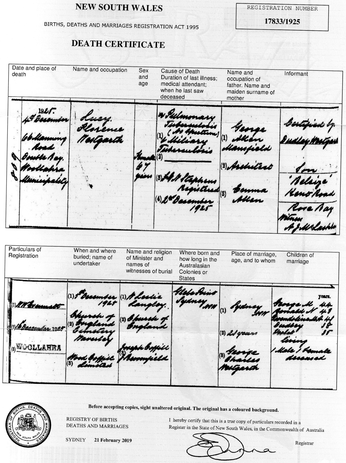 - Death certificate and the winding up of the estate of Lucy Florence by George, Ronald and Dudley