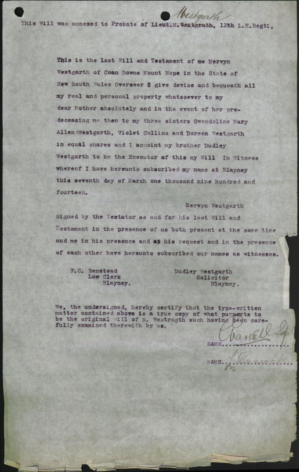 Mervyn made his Will at Blayney with Dudley before setting off to fight. Here is a copy: