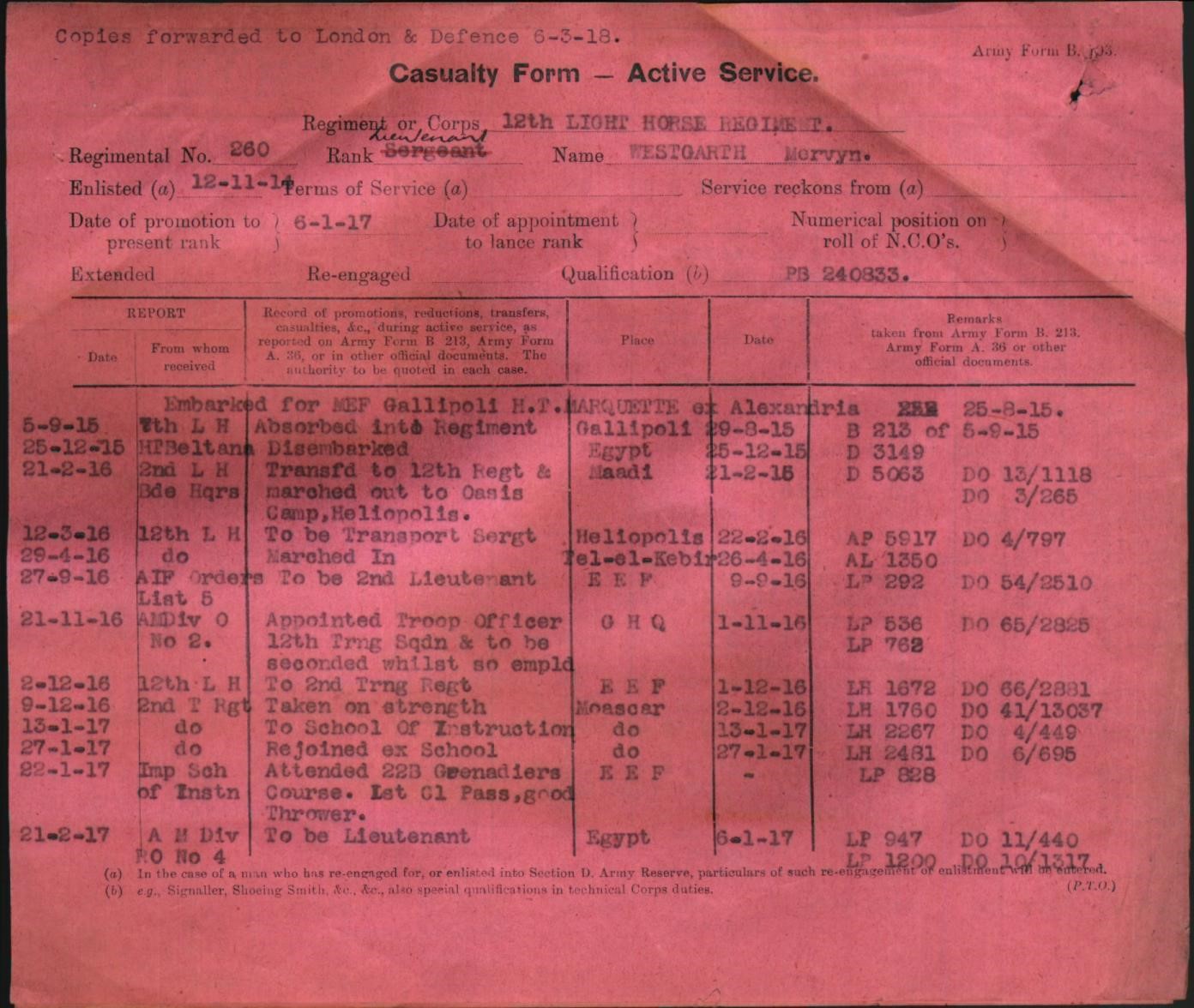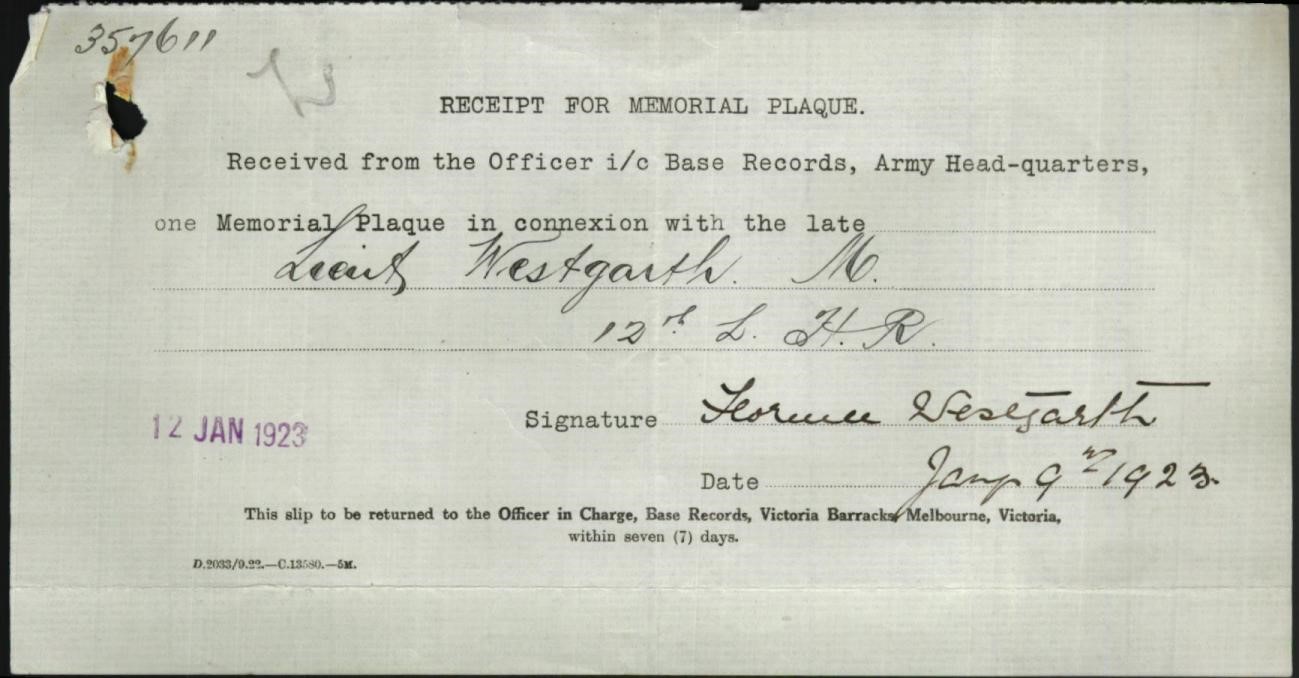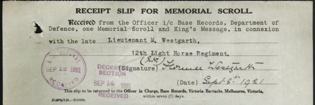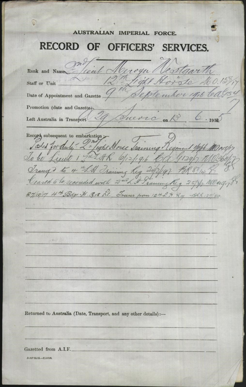 Second Lieutenant Mervyn Westgarth is on the First World War Honour Roll in the Courtyard. Details: 12th Light Horse