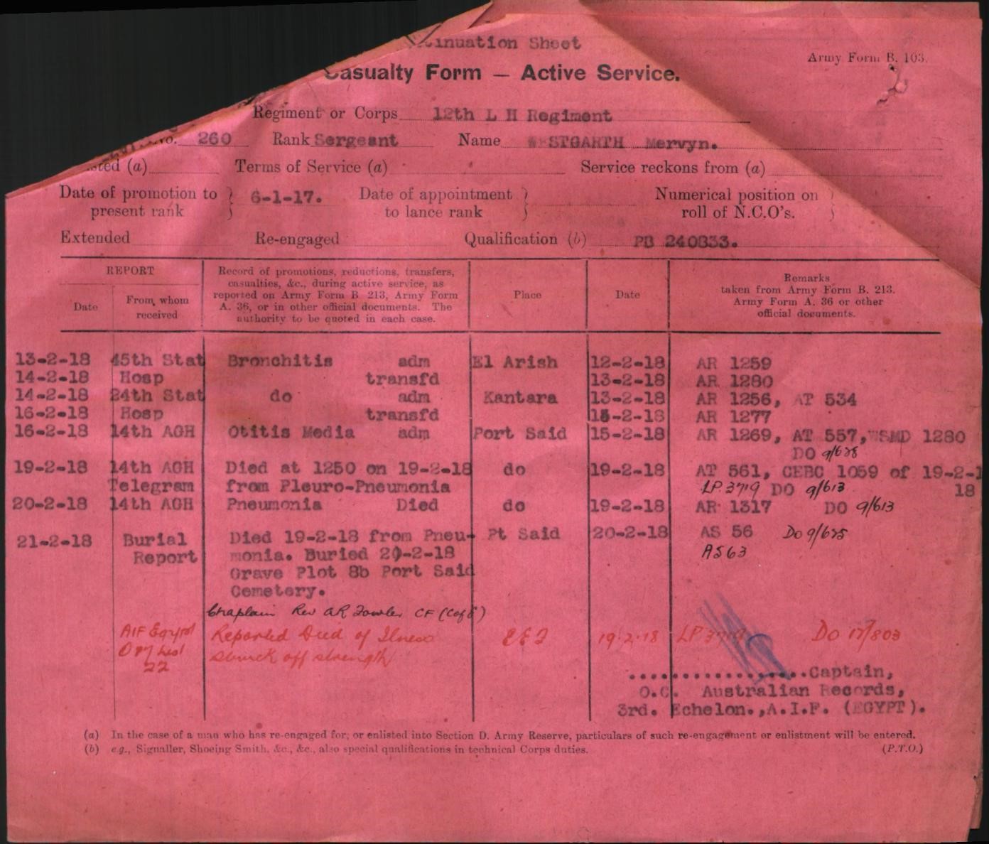 Mervyn died of pneumonia (19/2/18) in Palestine.