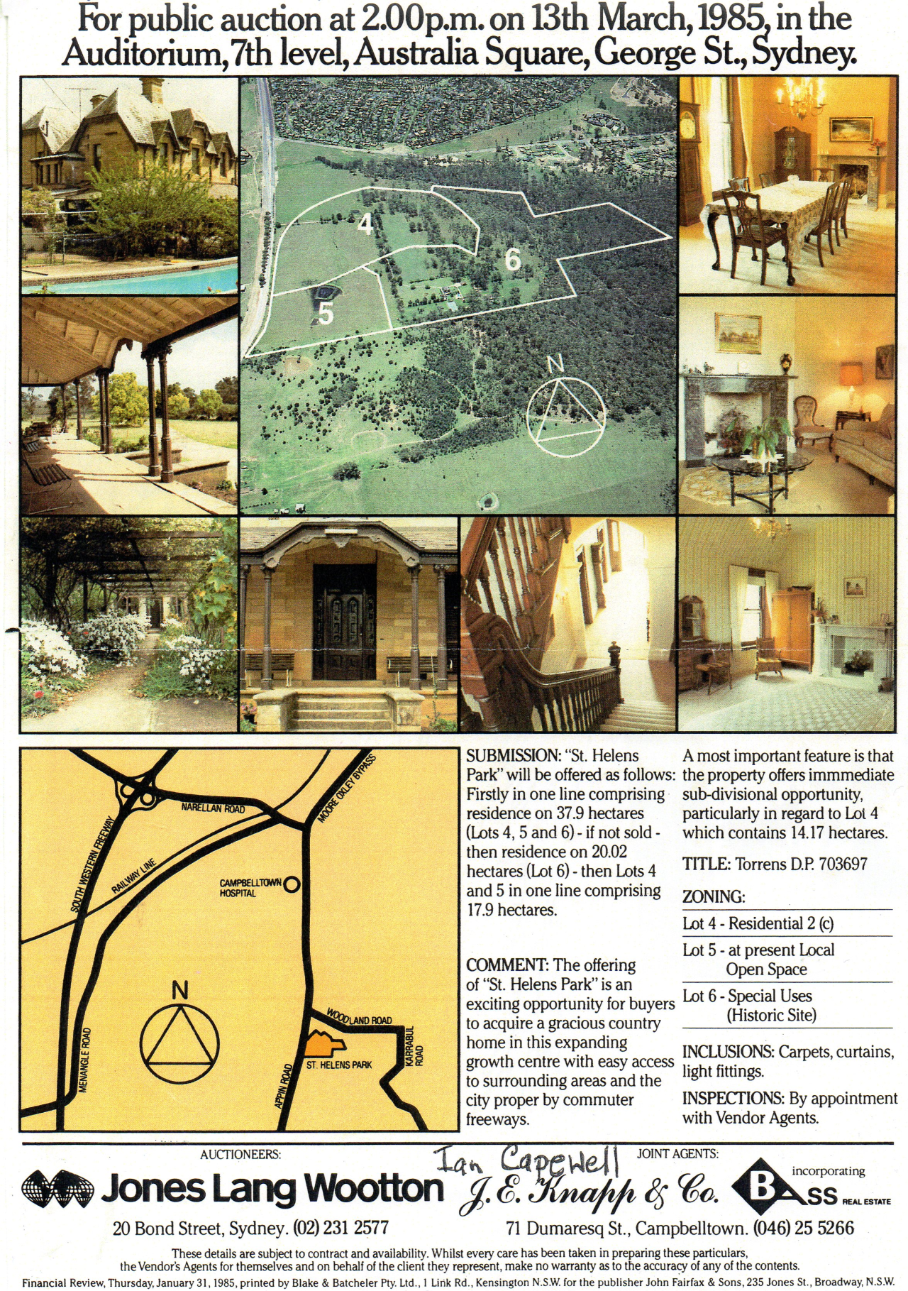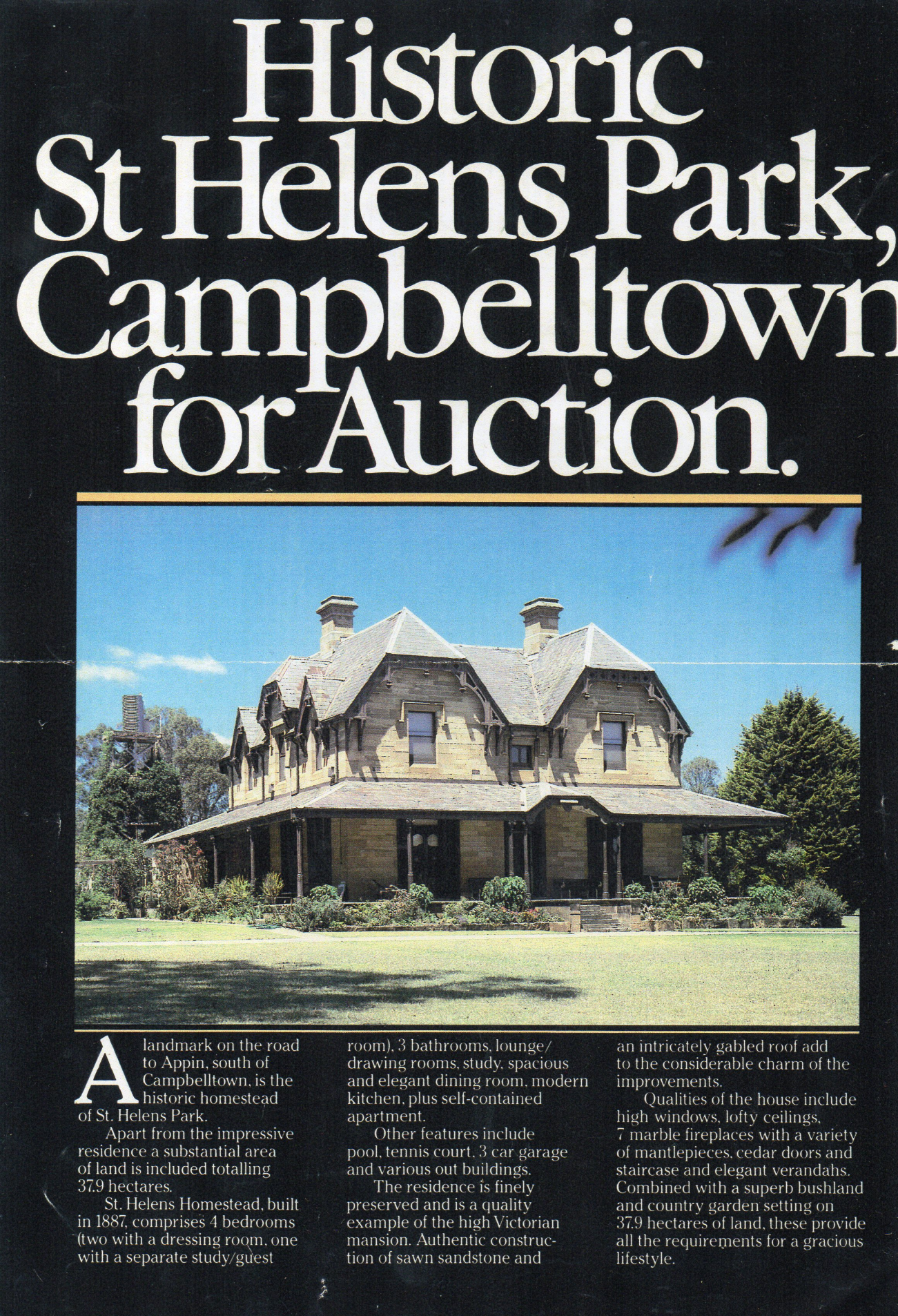 As a result of its impending sale and subdivision (see the flyer for the sale above) an Interim Conservation Order was placed over the property on 15 March 1985. A Permanent Conservation Order was placed over the property on 16 May 1986. It was transferred to the State Heritage Register on 2 April 1999 and is now registered on the National Estate, (Federal Heritage Commission). https://www.campbelltown.nsw.gov.au/files/assets/public/document-resources/aboutcampbelltown/heritage/sthelensparkhousedam.pd
