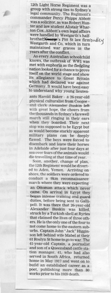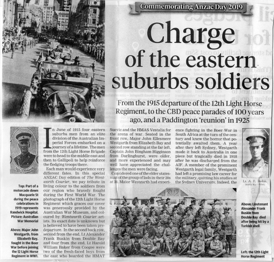 Julie Woodhill sent me this article from the Wentworth Courier, which concerns Eastern Suburbs soldiers who went to Gallipoli and includes John Ellesmere Westgarth. You can read the whole article online at the Wentworth Courier site. The photograph does not include Mervyn, who was also in the 12 Light Horse, because this is a photo of the officers. John (Jack) was second in command.