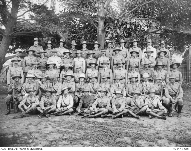 Left to right: back row: Lieutenants (Lt) E. H. Meredith, R. E. Ellerton, C. A. Brough, L. W. Davies [probably Louis Walter Davies], R. C. Dant, F. J. Dickson, A. W. K. Farquhar [Allan Wallis Kemmis Farquar], C. H. Bate, F. N. Snow [Frank Noel Snow], A. E. D’Arcy, Staff Sergeant Major (SgtM) W. Hudson, Assistant Instructor. Second back row: Lts A. Butler, A. B. Fitzhardinge, S. C. Calderwood [Stanley Charles Calderwood], C. G. Johnston, R. T. Williams, W. B. Christian, J. Kemp-Bruce, J. W. Connor, R. H. Richards, H. M. Sandy, K. W. A. Smith, R. C. Hunter. Third back row: SSgtM J. Dunlop (Assistant Instructor), SSgtM A. F. Clifton (Assistant Instructor), Lts H. W. Veness, C. K. Bragg, R. Barnett, Jack Rupert Cyril Davies, A. B. Pettigrew, J. G. Asser, W. J. S. Gillies, S. H. Haggarty, O. E. Carter, SSgtM V. McNamara (Assistant Instructor). Second front row: Lt H. N. Beiers, Captain H. F. White, Captain P. Connolly, Major G. D. Ross VD, Major R. C. Holman DSO (Instructor), Colonel D. P. White (Chief Instructor), Captains W. G. Alley, M. S. Kennedy [Malcolm Stuart Kennedy], P. Cureton, Lts H. F. Robinson, J. E. Westgarth [John Ellesmere Westgarth], M. Westgarth [Mervyn Westgarth], A. G. Brady. Front row: Lts E. St. J. N. Binnie [Ernest St John Northcote Binnie], E. Hyman [Eric Montagure Hyman?], G. N. Mills, W. T. Anderson, H. I. Johnson, G. Nugent [George Nugent?], E. B. Ralston [Edward Bolton Nugent?], A. M. Gerrard.