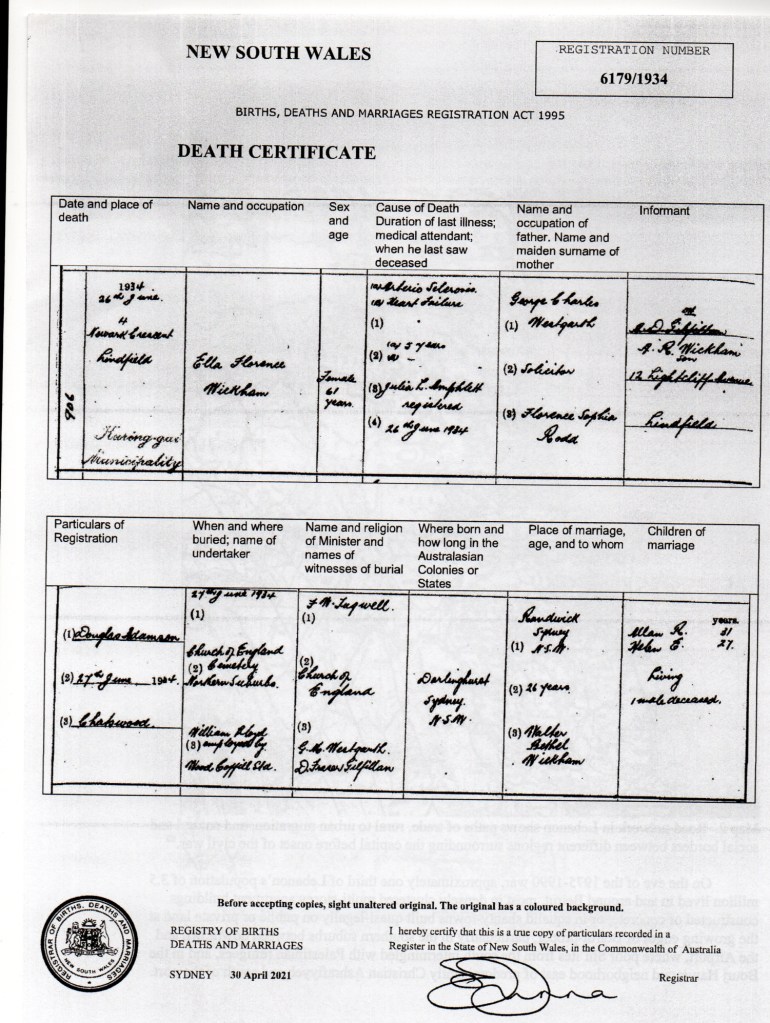 I cannot find out much about the life of Ella and her family. Her death certificate shows that she had moved to Sydney and died at 4 Newark Crescent, Lindfield. Her son, Allan, was living in Lindfield when Ella died, aged 61.