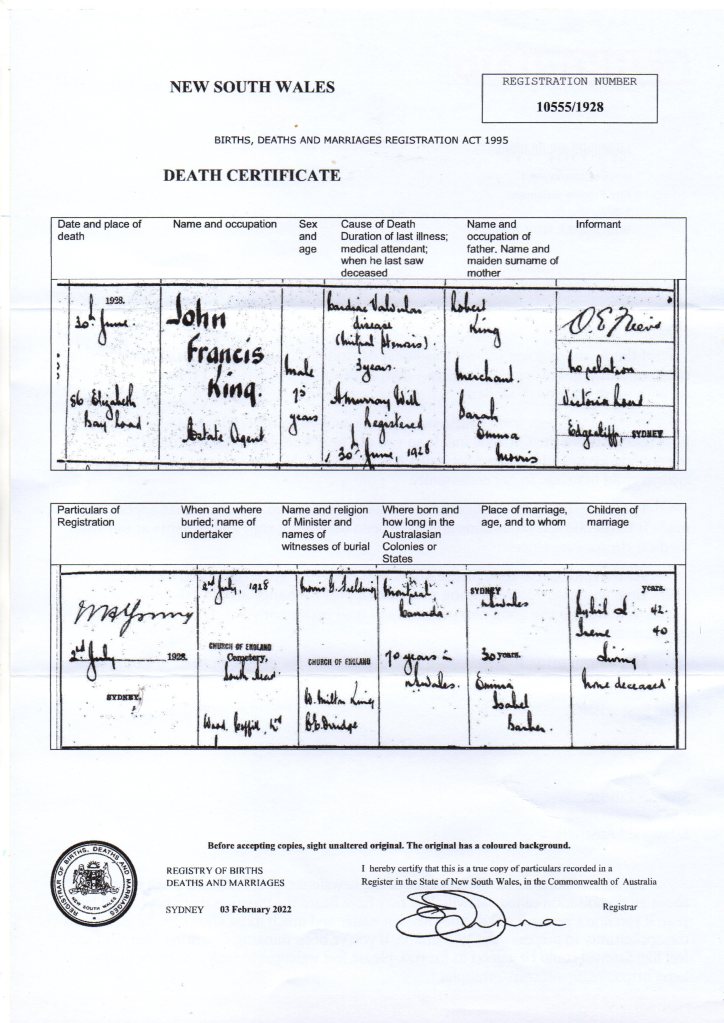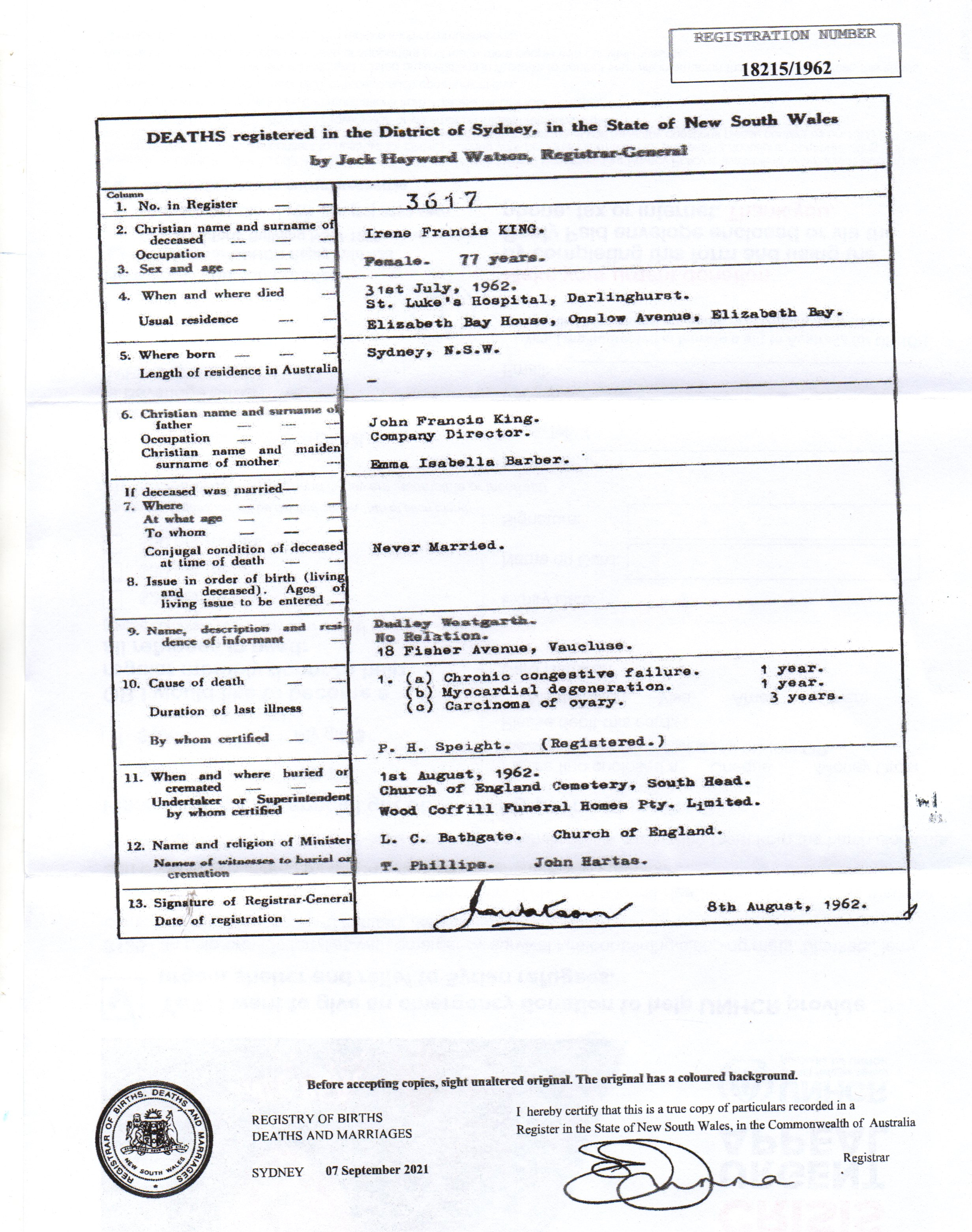 Irene was the daughter of John Francis King, Company Director, and Emma Isabel Barber. Irene was given the middle name of ‘Francis’. She was probably John’s cousin, but her father was born in Montreal, Canada to Robert and Sarah King. The name. ‘Francis’, is a clue that Francis William and John Francis were related. John Francis and family were living just along the road from Scotforth, at 86 Elizabeth Bay Road.