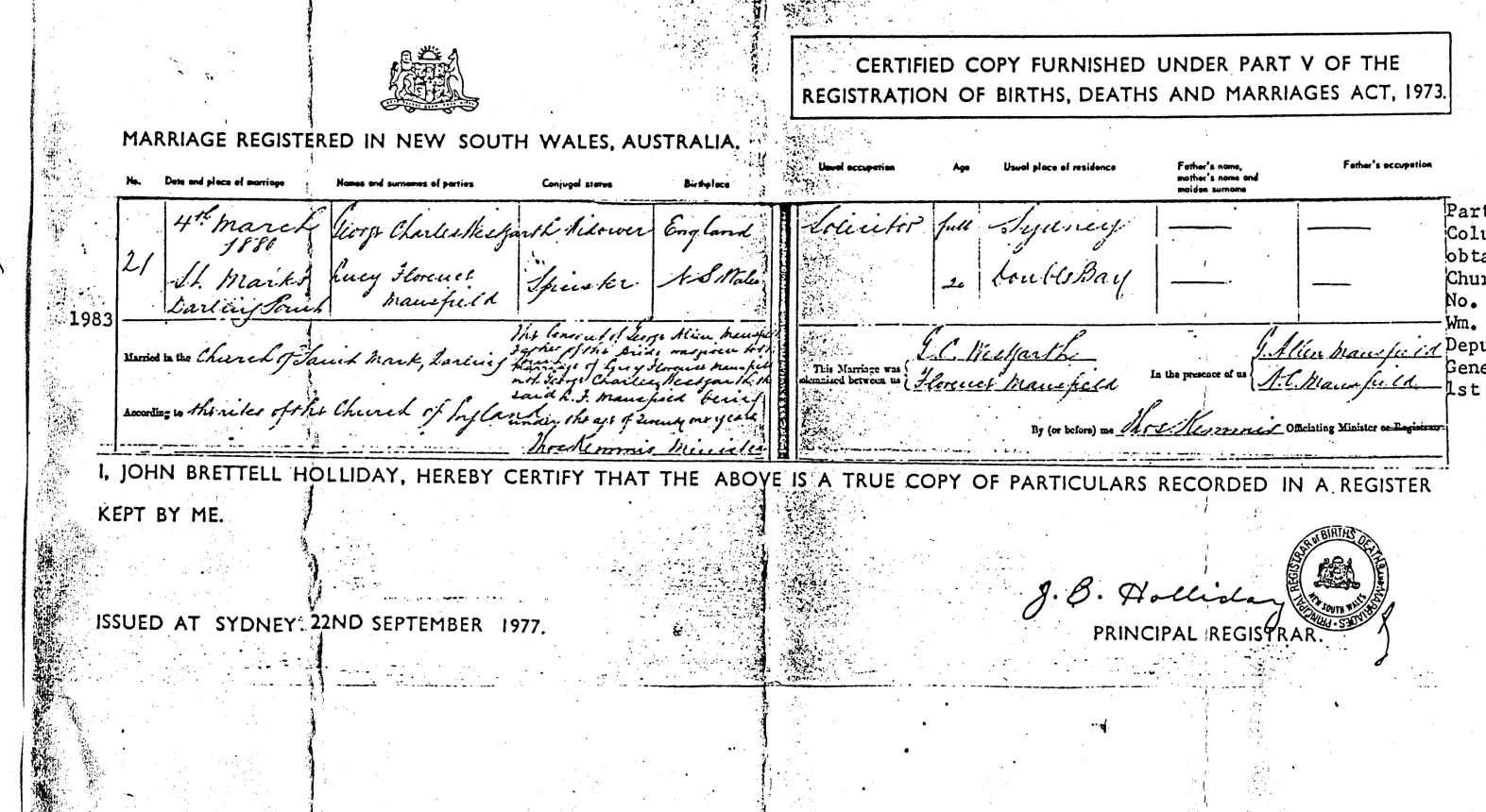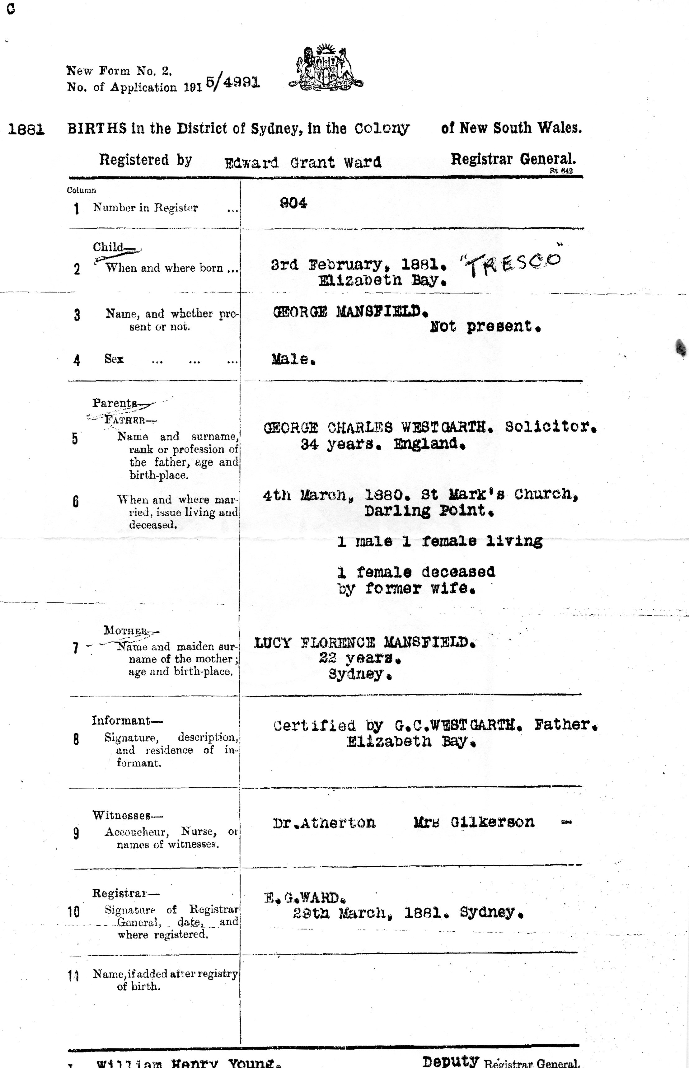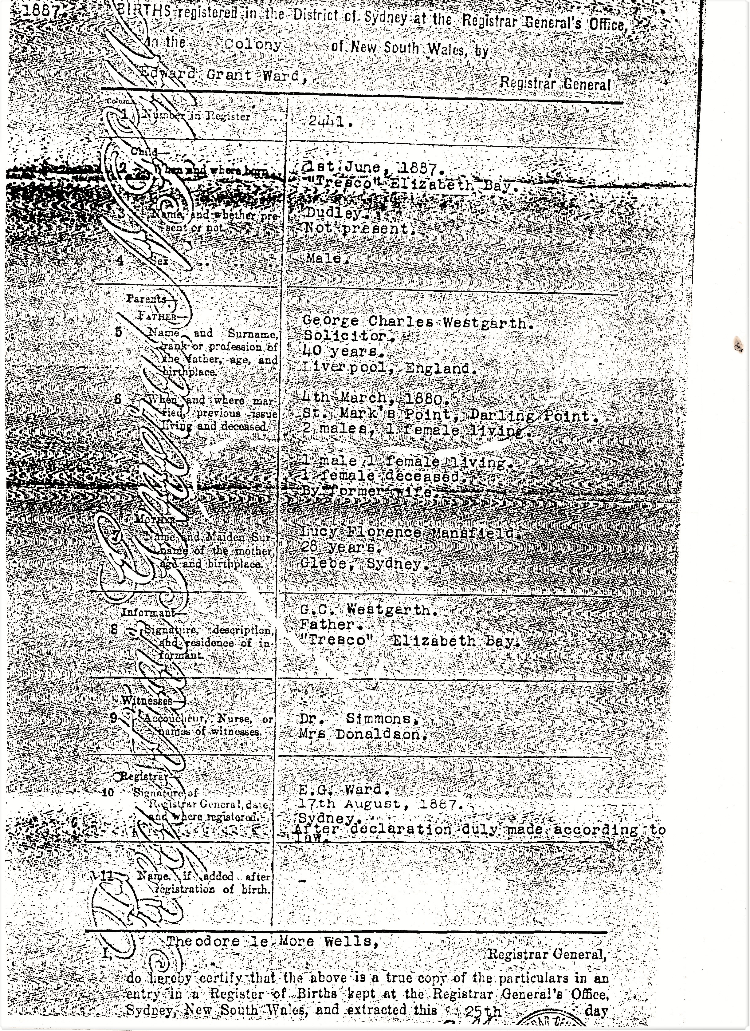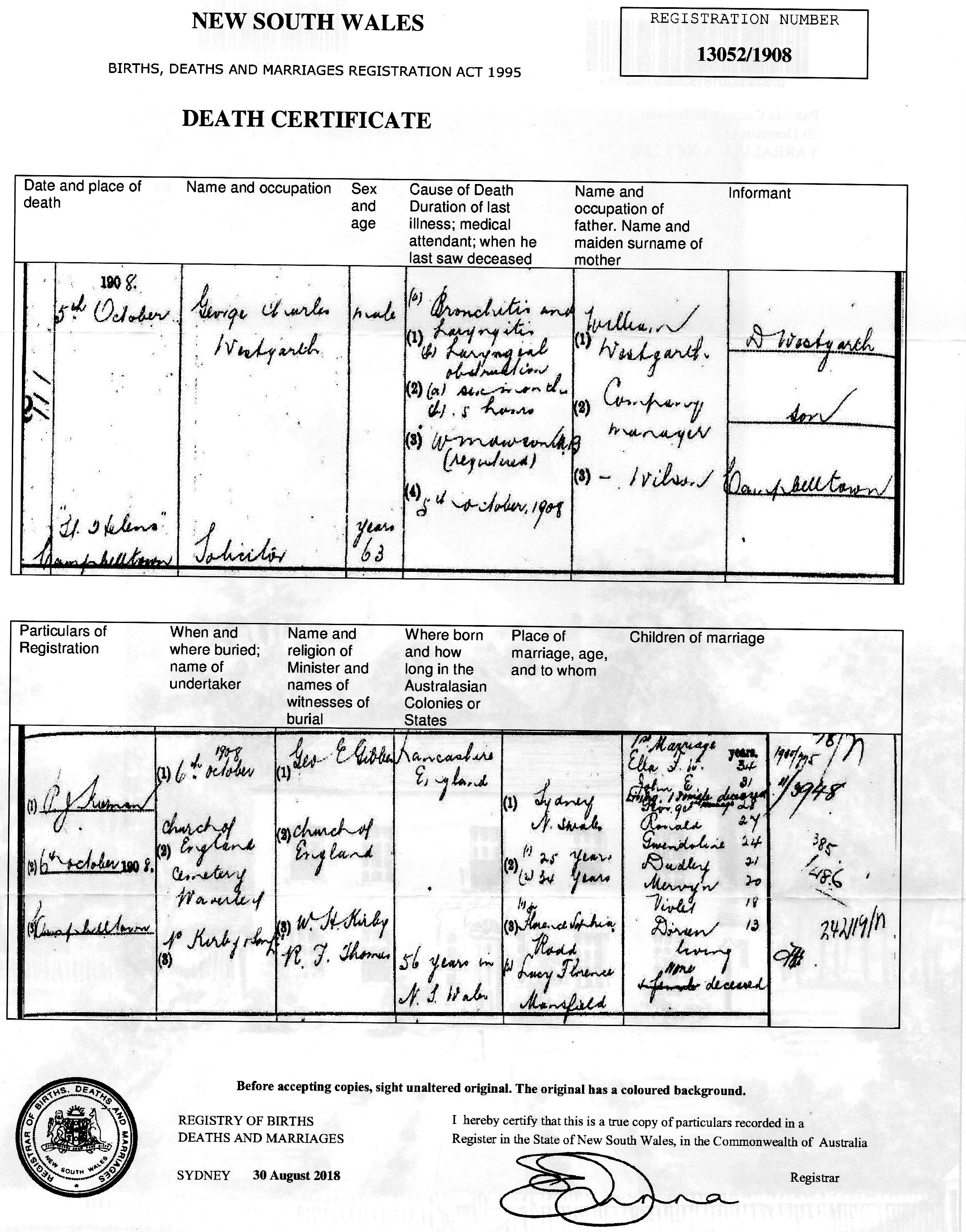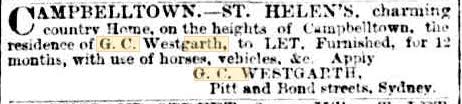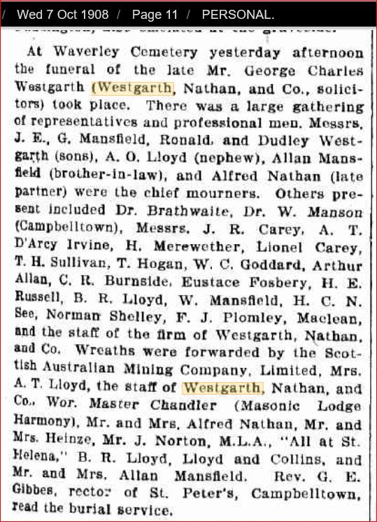 “Mr George Charles Westgarth, of Messrs. Westgarth, Nathan and Co., solicitors, died yesterday at his residence, St Helens Campbelltown. Mr Westgarth was highly respected in the profession. He was at one time in partnership with Mr Alfred Cape and subsequently joined the firm of Messrs. Norton, Smith and Co. Shortly after retiring from this firm, he entered into partnership with Mr Alfred Nathan. Mr Westgarth was married twice. His first wife was a Miss Rodd, his second a daughter of the late Mr George Allen Mansfield, the well known architect. Mr Westgarth leaves a widow, five sons and four daughters. “