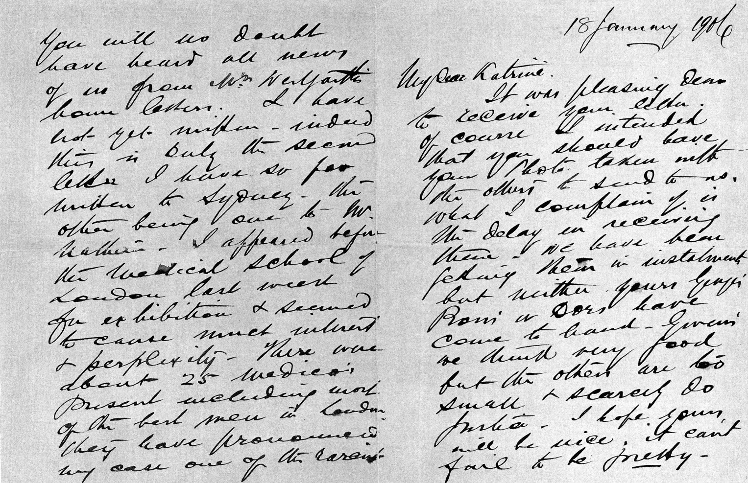 You will no doubt have heard all news of us from Mrs Westgarth’s home letters. I have not yet written – indeed this is only the second letter I have so far written to Sydney – the other being one to Mr Nathan. I appeared before the Medical School of London last week for exhibition and seemed to cause much interest and perplexity. There were about 25 medicos present including most of the best men in London. They have pronounced my case one of the rarest and whether I can be cured or not seems problematical. They have all opined that it is not a case of either eczema or gout for which I was so long treated in Sydney. They say it is in no way constitutional but simply a local skin trouble probably brought on from a severe chill. I am to all appearances much the same as when I left – probably a little better – but I could scarcely expect much from the short time I have been under treatment here.