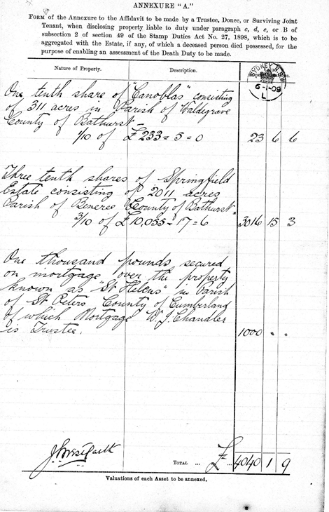 John, or Jack as he was called, the eldest son, artilleryman with private income thanks to Florence Sophia’s legacy, came to the rescue of the family. An Annexure A was added to the estate papers, which stated that George Charles was entitled to £3040/1/9d for his share in the properties of his wife’s inheritance, Canoblas and Springfield. George Charles had a one tenth share of revenues from Canoblas and three tenth shares in Springfield. His estate was also entitled to £1000, which seems to have been given to John for a mortgage over St Helens and which was now repaid, according to the affidavit ‘O’ signed by Jack and Ella.
