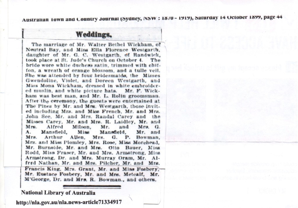 Ella was already 18 when the family moved into St Helens. She may have spent more time in town. Wealthy girls ‘came out’ at age 21 or earlier and she would have gone to many social occasions. She was 21 in 1894. Then, at age 26, in 1899, she married Walter Bethel Wickham, in Randwick, at St Jude’s Church and afterwards at The Pines.