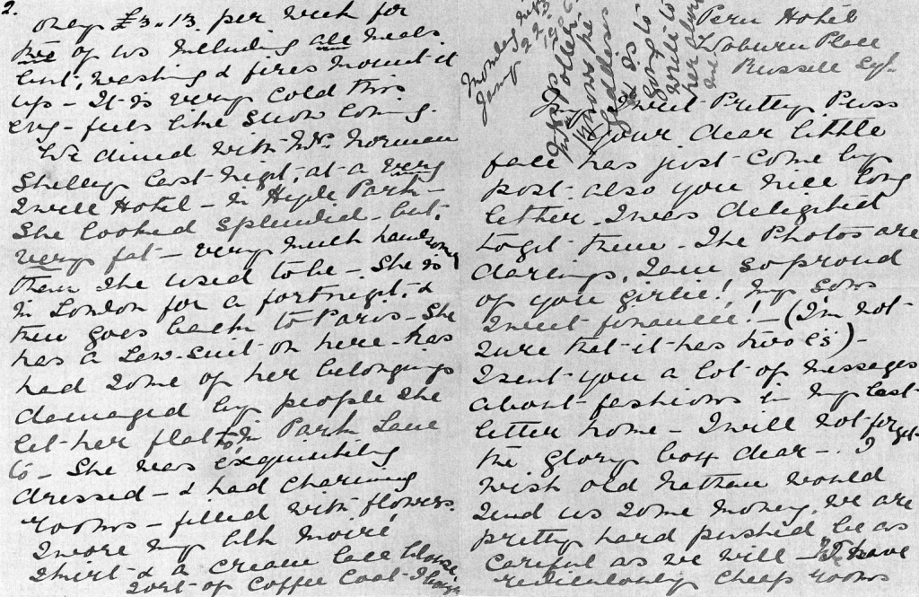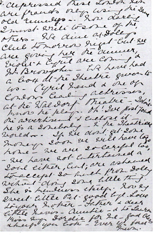 Now darling I must write to some of the others – We dine at Dolly’s club tomorrow night but we are giving her the dinner, Violet and Cyril are coming and Mr Browjohn(?) – We have had a box at the theatre given to us – Cyril …………… and one of London’s leading actresses, at the Waldorf Theatre – I don’t know the play. Oh! I’ve just found the advertisement and enclose it – he is a somebody in the theatrical world -. If we don’t get some money soon we will have to go home – we are so careful too, – we have not entertained a soul either, but are ashamed to accept so much from Dolly without doing some little thing. She is kindness itself.