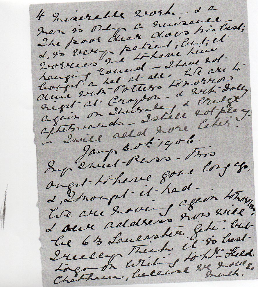 January 30th 1906: My sweet Puss – This ought to have gone long ago and I thought it had. We are moving again tomorrow and our address now will be 63 Lancashire Gate – but I really think it is best going on writing to Mrs Field Chatham, because we move so much.