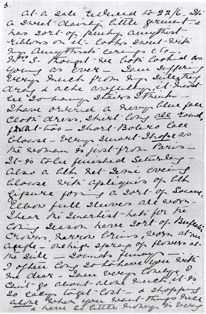 Mrs S thought we both looked as young as ever – I am suffering very much from my sides. They drag and ache awfully. It must be so many stairs I think – I have ordered a navy blue face (?) cloth dress, skirt long all round, front too – short bolero lace blouse – very smart I hope, as the woman is just from Paris. – It is to be finished Saturday – also a black net semi evening blouse with appliques of black guipure forming a sort of souave. Elbow full sleeves all worn – I hear the smartest hats for the coming season have sort of Beefeater crowns, narrow brims, worn at an angle – one high spray of flowers at the side – sounds funny. I often long so to have you with me dear – I am very lonely. I can’t go about alone much, it is so easy to get lost – and shopping alone when you want things nice and have so little money is very miserable work – and a man is only a nuisance -. The poor dear does his best and is very patient, but it worries me to have him hanging round – I have not bought a hat at all. We are to dine with Potters tomorrow night at Croydon and with Dolly again on Thursday and bridge afterwards – I shall not play… I will add more later.